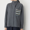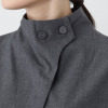 襟は、比翼仕立ての前立てに連なる大きめのスタンドカラーデザイン。