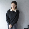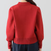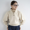 やさしげな襟パターンがお顔周りを華やかに演出。ふんわりとした袖と長めのリブでモード感あふれる装いに。