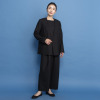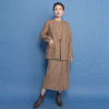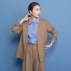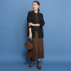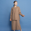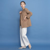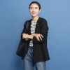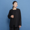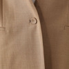 襟元は、首から細長くつながるVネックでお顔周りをすっきりと見せます。前身頃のダーツと前後のわき寄りパネル切り替えにより、スクエアシルエットながらも立体的で美しいフォルムを実現。高めの袖山に袖山布を縫い込んだ丁寧なつくりで、腕もすっきり見えの2枚袖仕立て。ヒップが隠れる安心感のある丈で、後ろ裾スリットにより動きやすいのもうれしいポイント。共布で包んだ控えめなボタン使いと玉縁ポケットが上品さを演出。総裏仕立てで滑りが良く着脱しやすい一着です。