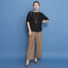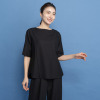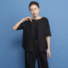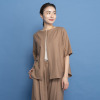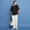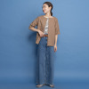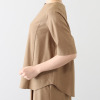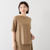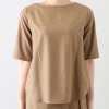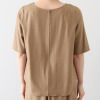 襟元は横に広めのクルーネックで、詰まりすぎずに首元をきれいに見せてくれます。前後どちらでも着用できる仕様で幅広いスタイリングが可能。ブラウスとしてジャケットのインに着用したり、羽織りとして涼やかに着こなしたりと、さまざまなコーディネイトが楽しめます。