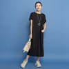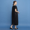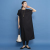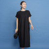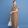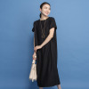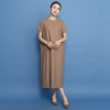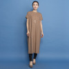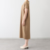 襟ぐりの後ろ中心に同系色で包んだスナップボタンをあしらい着脱しやすく、また、裾スリットを入れて歩くやすく仕上げました。