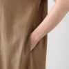 少しモードな印象もある、シンプルでミニマルなデザイン。詰まりすぎず広すぎない襟ぐりは、お気に入りのネックレスが映え、秋冬にはインにハイネックニットを着ても窮屈になりにくい、程良い開き具合。襟ぐり・袖口は二重仕立てで取り付けた切り替えがきちんとした印象でカジュアルすぎない印象。袖は気になる肩から上腕周りをカバーする丈感に。