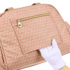 表地と裏地は、はっ水加工をほどこした生地を使用。雨に濡れても水をはじきやすいため、お手入れしやすいのが特徴です。パリの石畳からインスパイアされたキューブ柄を配した当ブランドオリジナルデザイン。