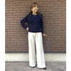 首元はお顔周りをすっきりと見せるクルーネックながら、アクセサリーなしでも十分に華やかな印象を与えます。