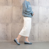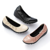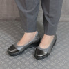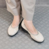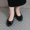柔らかく美しい艶感が特徴の羊革を使用。つま先を合皮エナメル素材で切り替えたトゥキャップデザインで、大人のエレガントさを表現しました。履き口のラウンドのカットラインが、足の甲をきれいに見せてくれます。