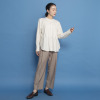 肩から胸下にほどこされた左右2本ずつのタックは、タック止まりを胸下に、タック位置を脇寄りに設計することで、ゆとりを確保しながらもすっきりとしたシルエットを実現。