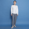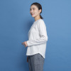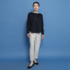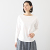 身頃は身体に張り付きすぎないジャストサイズで、スタイリッシュな見映えと安心感を両立。襟ぐりの内側にパイピングをほどこして、華奢で女性らしい印象に仕立てました。裾は前後中央をフラットにしつつ、脇に向かって緩やかなカーブを描くようにすることで、軽やかな仕上がりに。