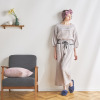 パンツは、トップスをインしてもサマになるようウエストに飾りリボンをあしらいました。左右にポケットを配し、利便性も考慮したつくりです。脚さばきのしやすい九分丈に設定。