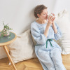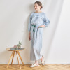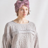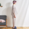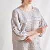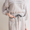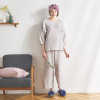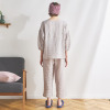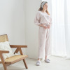 綿混のシャーリングダブルガーゼ素材を使用。ムレにくく、肌がべたつきにくいため、快適な睡眠環境に導く、おすすめの素材です。トップスは、肩を落としたオーバーサイズにデザイン。袖は七分袖に設定し、ゴムを配したふっくらとしたつくりです(ゴムの取り換え口あり)。胸元にタックを入れたことで、胸元の透け感やラインをカバーします。