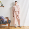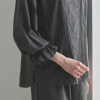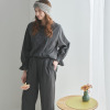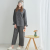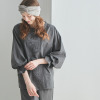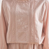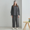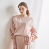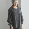 トップスは、襟ぐりの小さなフリルにピコット加工をほどこしており、素材の透け感とも程良くなじむ軽やかな仕上がりに。前身頃は、センターに縦に刺しゅうをほどこし、サイドにはピンタックを入れて立体感を出しました。透け感と肌当たりを考慮し、前身頃を二枚仕立てにしています。ふんわりとした袖で女性らしさをプラスしました(ゴムの取り換え口あり)。