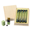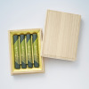 お香を手作業で一つ一つ丁寧に把に巻いた後に桐箱にお入れした、贈答用にもおすすめの桐箱入りと、スティックタイプ、スティックタイプ用香立をセットにしてお届けします。