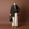 ドロップショルダーでゆったりとしたシルエットながら、コンパクトなラウンドネックとすっきりとした袖でバランスを取り、リラックス感ときちんと感を意識。