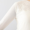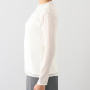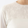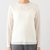 胸元から下の部分には、透け感を抑えるストレッチ裏地を重ね、安心して着用できる仕様に。一方で、胸元から上は裏地を省くことで、軽やかでエレガントな透け感を楽しめます。程良いゆるさのあるシルエットで、身体のラインを拾いにくく、さまざまなスタイリングに取り入れやすい一枚です。
