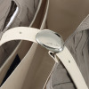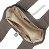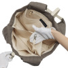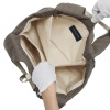 内側は複数のポケットを配置し、小物の仕分け収納が可能。後面に肩掛けしたまま使える縦ファスナーポケット、内部にはペットボトルや折りたたみ傘も収納可能なペットボトルホルダーをを備えています。開口部ストラップのギボシ金具は、年を重ねることにより自然に研磨されて角がだんだん取れて丸くなったストーンをイメージしています。