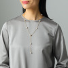 留め具をチェーンのコマに留めて、お好みの位置で長さ調整が可能。通常のネックレススタイルはもちろん、Y字スタイルでもお楽しみいただけます。さまざまな装いに合わせやすく、上品でエレガントな印象にしてくれる一本です。