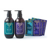 <カミージュ>より、髪の外側から内側まで補修し、ハリ・コシのある髪へ導く補修型ヘアシャンプーの増量サイズ(510ml)とその10mlサイズ×3、髪を補修しツヤ・潤いを与え、指通りを良くするヘアトリートメントの増量サイズ(510ml)とその10mlサイズ×3のセットです。