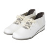 日本製の柔らかな牛革をメインに使用。フロントの透け感のあるゴム素材が、涼やかな季節感を演出しながら足になじみます。履き口と両サイドに配された伸縮性の良いゴムにより、スムーズな着脱を実現。単純な幅広ではなく、親指の付け根に高さを持たせ、立体的でゆとりのある4Eながら、すっきりスマートに見える当ブランド独自の木型を使用。