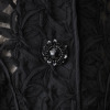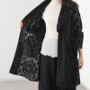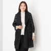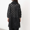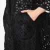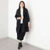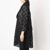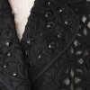 本体は、チュールの基布に楊柳柄シフォン生地をテープ状にしたものをあしらったデザイン。コートらしい重厚感を極力取り除き、羽織るだけで春の訪れを感じられる軽やかさを実現。同系素材の花柄モティーフを自然な感じでパッチワークし、大きな襟元にはビジュウをほどこすことで華やかさをプラス。小顔効果も抜群です。当ブランドオリジナルで作製したビジュウをあしらった花ボタンを採用しながら、実際はシンプルなスナップボタンで着脱できるよう工夫。襟ぐりや袖口などにはパイピング始末をほどこしました。