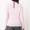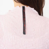 全体は極細クリスタルプリーツ加工をほどこし、広がりすぎないようにグラフィカルなプリーツを斜め、左右に入れた、チェック柄をアレンジした立体感のあるデザインに仕上げました。バイヤスの地の目に、さらにプリーツを左右にかけ、柄そのものの形を刺しゅう。そのまま固定するようにプリーツ加工を行い、刺しゅう糸を取るという工程を繰り返すことで、縦横斜めに自在に伸びる心地良い着用感を実現しました。ネック端や袖口、裾はメロウミシン始末で、女性らしいフリルのようなディテールをプラス。