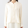 クラッシュ風なシワ加工を施した光沢感ある素材に、前身頃と表襟にラインストーンを熱圧着したヴィンテージ感あふれるブラウスです。シワ加工によって表面に表情がありながら、なめらかな肌触りで、一枚で着映える華やかさを実現しました。