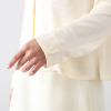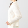 細いスタンドカラー風の襟がフェイスラインを美しく見せ、ラインストーンの輝きが上品な印象を引き立てます。シルエットは胸ダーツと前後のウエストダーツで美しく仕上げ、ボクシーに近いフォルムでありながら女性らしさも感じられるデザイン。裾スリットや袖口のスリット風開きなど、さりげないディテールにもこだわりました。