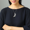 幅9mmUPの貝パールとCZをあしらった、ペンダントブローチです。すっきりとしたリーフモティーフに、貝パールを贅沢にアクセント使いしました。全面に散りばめたCZがキラキラと輝き、胸元に高級感のある華やぎをプラス。軽やかな着け心地で、フォーマルにもカジュアルスタイルにも幅広くお使いいただけます。