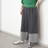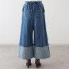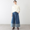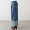 ステッチで遊ぶワイドデニム。ホームソーイング風のヌケ感と裾の深折りがトレンド感を醸し出します。