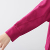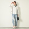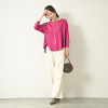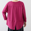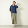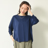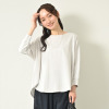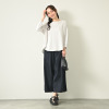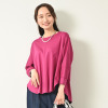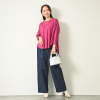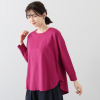 襟開きは詰まりすぎないクルーネックに設定。肩から袖にかけたラインが二の腕周りを、前後差のあるチュニック丈が腰周りをカバー。前後の中心の切り替えが縦のラインを強調。前から見るとシンプルながら、後ろは背ヨーク切り替えとペプラム切り替えで女性らしいニュアンスを持たせました。ラクなのに着膨れせず、おしゃれ見えを叶えてくれるアイテムです。