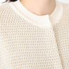 ラメリリヤーンとポリエステルコットン糸のミックス感が表情たっぷりな、着映えするニットカーディガンです。華やかなツイード編地の凹凸感に対し、リブでデザインを引き締めました。襟ぐりや袖口、裾口はラメなしのリブ編みで切り替え、襟リブは縫い代が首に当たらないよう袋編みでリブを付けています。1番下のスナップは裾リブにかからない位置に。