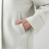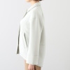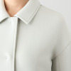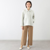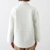 前身頃はドロップショルダー、後ろ身頃はラグランスリーブというこだわりのパターン設計。3面体のパターンによって脇線をなくすことで立体感を出しつつ、着丈に大胆な前後差をつけることで躍動感があるデザインに仕上げました。すっきりとした小さめのシャツカラーがお顔周りをシャープに演出。前中心のスナップボタンを表に見せず、カンヌキ止めをアクセントとしてプラス。片玉縁ポケットがコートのような品格を与えています。
