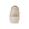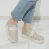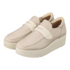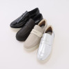 甲部分はゴムバンド仕様で、足の動きにしなやかにフィットします。ライニングには抗菌防臭加工をほどこしたポリウレタン素材を採用し、クッション性を確保。さらに、インソールにも適度なクッションを入れ、歩行時の負担を軽減。厚底部分が空洞構造のため、見た目はしっかりしていても軽い履き心地です。アウトソールにクラッチ素材を採用した、滑りにくい溝を配したつくり。