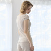 当メーカーのオリジナル素材である“丸福ガーゼ”を用いたインナーです。オーガニックコットンを65%使用。シルクタッチの特殊なナイロンとポリウレタンを用いたハイブリッド素材にすることで、柔らかく、心地の良い肌触りを実現しました。吸水速乾性と抗菌防臭性があるのもポイントです。綿混素材のため、暑い時はムレを抑え、寒い時は編目の隙間の空気層が断熱材のような役割となり、暖かな着心地に。