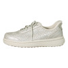 アッパーには柔らかくしなやかな合皮素材を使用。デザイン性のある花柄パンチングと上品な光沢感のある箔をほどこした、高級感ある仕上がりです。ワンポイントのシューレースチャームは取り外しができます。メーカー独自技術のバネ構造により、かがまずに立ったまま脱ぎ履きが可能です。ヒール部にバネを内蔵しており、踏んでも元の位置に戻るため、簡単な脱ぎ履きとかかと部分と足首がフィットする確かなホールド感を両立。