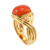 地中海サンゴの大きなカボションをあしらったリングです。ボリュームのあるアームで左右から包み込むようにデザインしました。さらに空間を設けてホワイトサファイアを添え、軽やかな印象の大人のサンゴジュエリーに仕立てました。