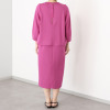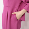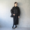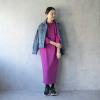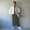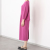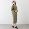 しなやかできれいな表面感が魅力の、ストレッチがしっかり効いたダンボール素材を使用。若々しく見える首元のラインと、スタイルアップ効果を狙ったややハイウエスト目の位置に入れた切り替えデザインが特徴。ゆるやかなナローシルエットで身体のラインを拾いすぎず、コクーン状の丸みのある袖がモード感を演出します。