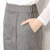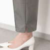 前開きで着脱しやすく、ウエスト後部はゴム仕様で体形に合わせて快適にフィット。裾にはスリットが入っており、軽やかなクロップト丈と相まって動きやすい仕上がりを実現。トップスのサイズを選ばないデザインで、カジュアルコーデはもちろん、ビジネスシーンでも活躍します。