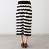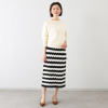 7ゲージで編み立てた肌触りの良いニット素材をメインに使用。シェブロンストライプという波型模様が特徴で、ボーダーのカジュアルさとレースのようなエレガントさを両立し、特別な雰囲気を演出します。ウエストを総ゴム仕様にした窮屈に感じにくいつくり。