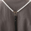 パール調モティーフのビーズを贅沢に使用した華やかなサスペンダーです。クラシカルでオーセンティックな雰囲気を醸し出すパール調モティーフのビーズが、装いにシックなアクセントを添えます。後ろ身頃側に合成皮革素材を採用することで長さ調節ができるようにして、幅広い方が使用できるように工夫しました。