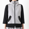 一見カジュアルなデザインながら、計算された切り替えラインが女性らしさを引き立てます。前身頃は内側に入れ込んだ切り替えで視線が中央に集まり、自然と細見え効果を発揮。重ね着しても横に広がりにくく、すっきりとしたシルエットを保ちます。後ろ身頃の異素材切り替えが立体感を生み、ベスト特有の単調さを解消。