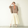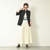 襟部分に配した繊細なチュールが首周りをやさしくカバーし、ネックレスなしでもお顔周りがパッと華やかに見えるのも魅力です。ジャケットとの相性抜群で、Vラインからチュールがのぞくことで、辛口なジャケットに甘さと女性らしさを添えてくれます。