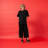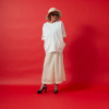 立体感のあるレース使いで、フォルムはシンプルながらも個性が光るパンツ。糸を放射状に束ねた花弁状の立体編みが、平面的なレースでは表現できない独特の存在感を醸し出します。花柄を抽象化し幾何学模様と組み合わせることで、レース特有の甘さを抑えたモード感あふれるデザインに仕上げました。