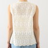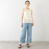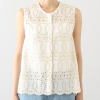丁寧にほどこされたカットワーク加工が軽やかさと奥行きを生み、裾のスカラップ使いが優雅な印象を添えます。低めのスタンドカラーが首元をすっきりと見せ、清潔感のある装いをアシスト。ブラウスとして着用するのはもちろん、前を開けてジレのように着こなすのも素敵です。