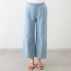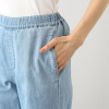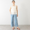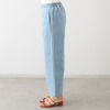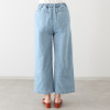 ウエストは総ゴム仕様でありながら、フロントはギャザーが寄らない設計で、すっきりとした腰回りを実現。内側にドローストリングを配し、ひも先にはシルバーカラーの金属チップをあしらいました。程良い広がりのワイドシルエットは脚のラインを拾いにくく、自然に体形をカバーします。前立て部分にステッチをほどこし、デザインアクセントに。後ろのポケットは立体感を持たせ、後ろ姿も美しく仕上げました。