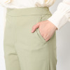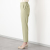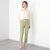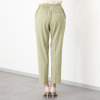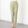オンオフともに使い勝手の良いベーシックなデザイン。センタープレスによりシャープな印象を与え、裾はルイス仕上げできれいめに仕立てました。ウエストは総ゴム仕様ながら、フロントにはギャザーを寄せず、すっきり感を演出。プルオンタイプでリラックス感のあるはき心地です。後ろヒップに飾り玉縁ポケットを配すことで腰高効果も狙いました。