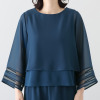 すぽっと被るだけで完成するレイヤード風デザイン。インナーはタンク型で、その上からシフォンジョーゼットをジャージーよりもコンパクトな丈で重ねています。2枚が縫製されている部分は襟ぐりのみ。着丈差とシアー効果で自然に細見えし、どこから見ても美しいバランスに。揺れ感のあるシフォンジョーゼットと袖口の透けボーダーが、女性らしく上品な印象を演出します。