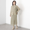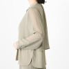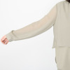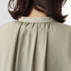 透けすぎない絶妙なシアー感と落ち感が魅力のシフォンジョーゼットをメインに使用しました。身頃の下側には伸縮性のあるジャージー(ダブル編みポンチ)素材を採用。どちらも強撚なので肌離れが良く、さらっとした着心地で、身体のラインを拾いにくいのがうれしい。素材特性によりシワになりにくく、イージーケアな点も魅力です。