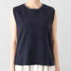 コンパクトに仕上げたノースリーブ型ニットプルオーバー。コットンとポリエステルを組み合わせた糸を使用しており、コットンならではの柔らかさと吸湿性を備えつつ、ポリエステルの素材特性により汗をかいても乾きやすく、軽やかな肌触りを実現。