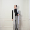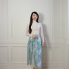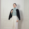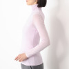 長繊維綿から作り上げ、一般的に細いといわれている80番手の単糸を用いた、当ブランドこだわりの生地を使用(※長繊維は当メーカー区分)。ソフトな肌触りと着心地を追求するために、糸の撚りや編地のテンションを何度も調節し、軽やかで柔らかい、伸縮性のある素材を作り上げました。フライス編みを採用しているため約280%伸び、締め返しが少ないので、さまざまな体形の方に心地良く着用していただけそう。綿素材のため汗をよく吸い、さらに薄手生地なので比較的乾きやすいのも特徴です。身頃は透けにくい二重仕立てなので、下着のラインが気になりにくい仕上がり(透け感が気になる方は、ベージュ系の下着を着用することをおすすめします)。袖は透け感が美しい一重仕立てで、ドレッシーな装いを演出します。