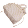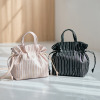バッグ本体、ハンドル部分には、ややウェーブがかったプリーツ加工を行い、さらにプリーツの凸部分に頭張り箔加工をほどこしたピッグレザーを使用。ショルダーストラップ、巾着ひもには、スムース牛革を採用しました。どちらも色やツヤなどを指定して作り上げた当ブランドオリジナルのレザーです。