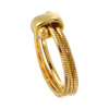 地金にステンレスを使用した、フレキシブルリングです。美しい8面カットのスネークチェーンをフューチャーした、モダンでユニークな3連デザイン。1本に繋がった長いチェーンを、スライダーを通してらせん状にまとめた構造で、スライダーを用いて自由に調節できるよう工夫を凝らしました。チェーンのエンドをスライドさせて全体を調節することにより、リングの内周をフレキシブルに変化させることが可能。締め付け感も少なく調整が利くため、対応サイズの範囲内であれば、お好きな指に着けてお楽しみいただけます。